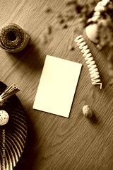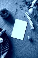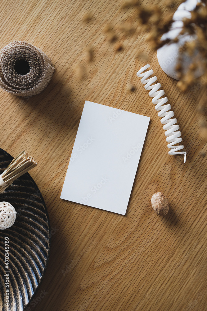 Wedding invitation mockup, vase of dry flowers and autumn decorations on wooden table. Flat lay, top view, copy space