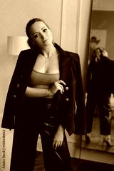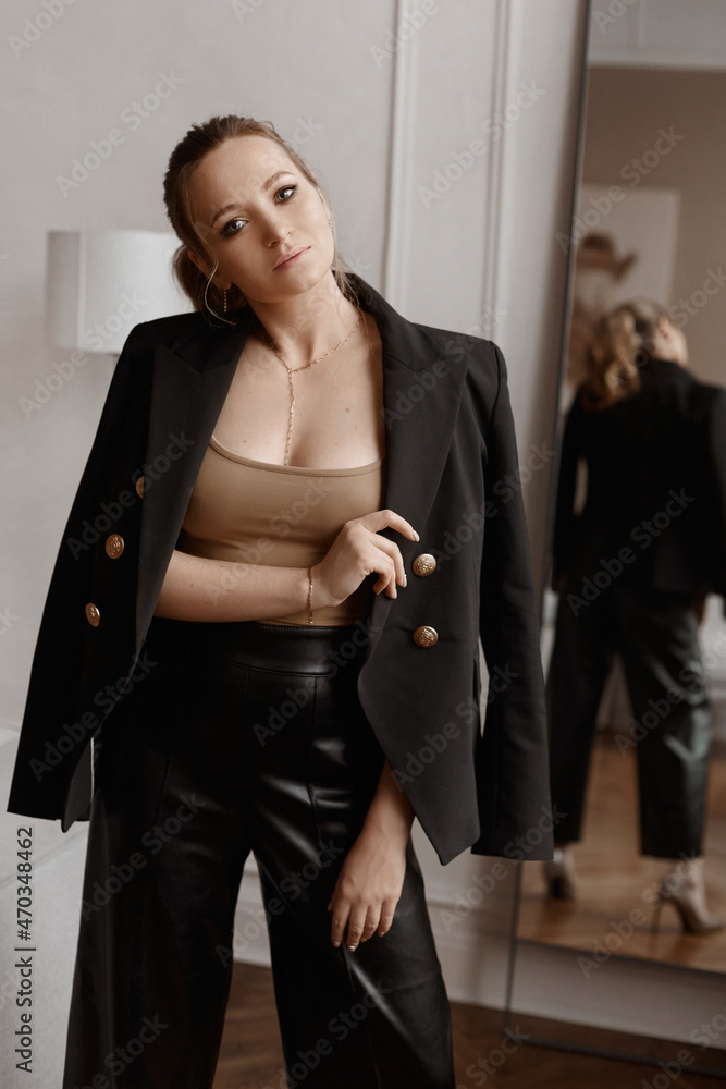 Adorable model girl in a trendy stylish blazer in the interior. Fashionable portrait of a young woman