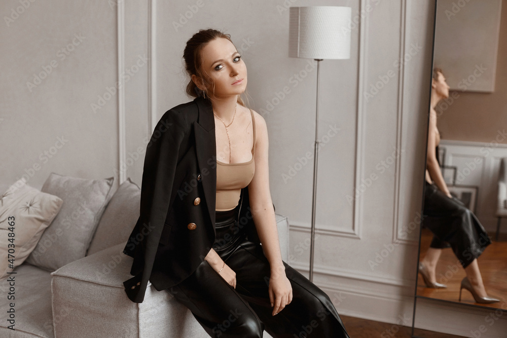 Adorable young woman in a trendy stylish blazer in the interior. Fashionable portrait of a young woman