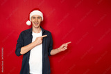studio portrait of cheerful guy in blue shirt and Santa Claus new year hat points with two index fingers at an empty free area of loyal advertising isolated on red Christmas background with copy space