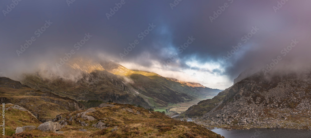 Epic Autumn landscape image of view along Nant Fracon valley in Snowdonia National Park with dramatic evening sky and copy space