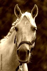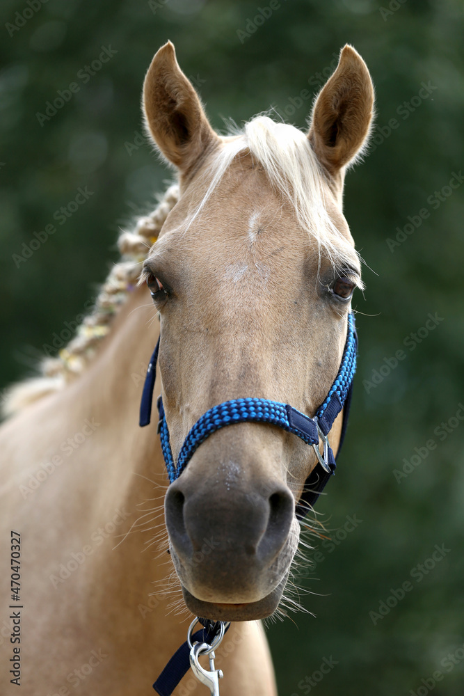 Colorful summer flowers in the mane of a young purebred horse