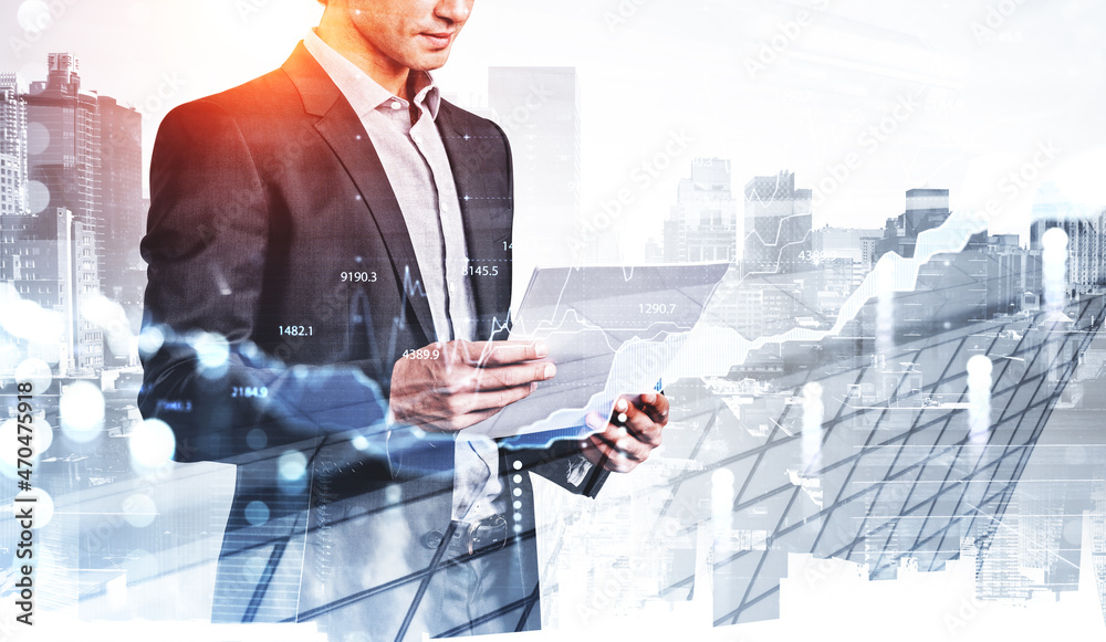 Businessman with business contract in hands, rising arrows and skyscrapers
