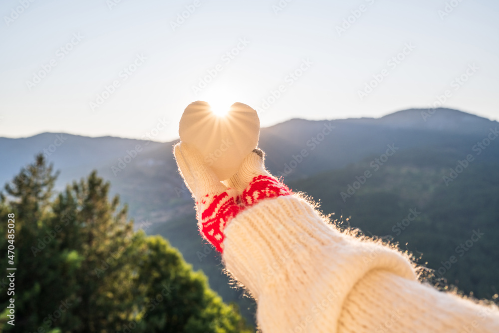 Woman traveler in christmas gloves holding snow in the shape of a heart on a background of mountains with sunbeams. Winter travelling concept