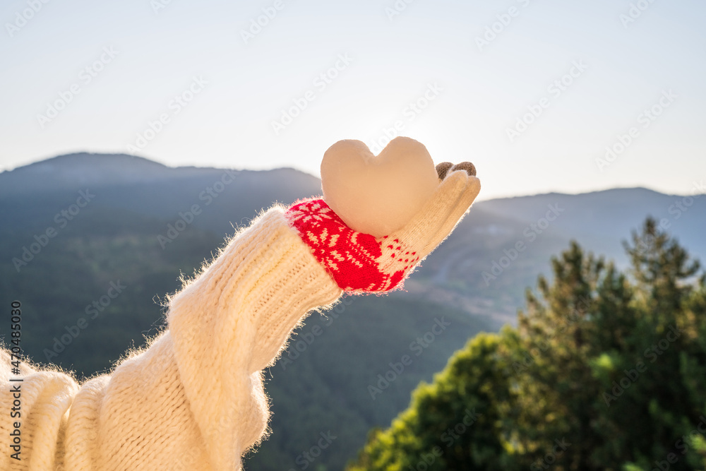 Female hands in christmas gloves holding snow in the shape of a heart on a background of mountains with sunbeams.