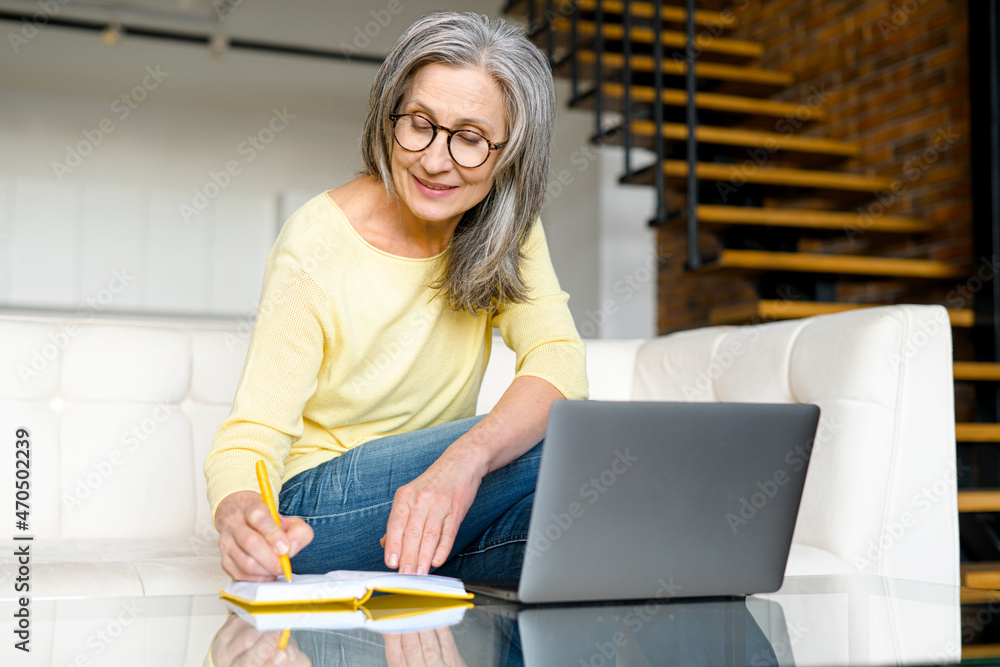 Mature focused woman watching online webinars on the laptop sitting on the sofa at home, taking notes, e-learning. Concentrated senior business woman researching, analyzing tasks in the network