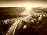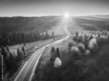 Aerial view of mountain road in forest at sunset in autumn. Top view from drone of road in woods. Beautiful landscape with roadway in hills, pine trees, green meadows, golden sunlight in fall. Travel