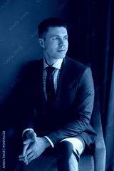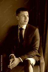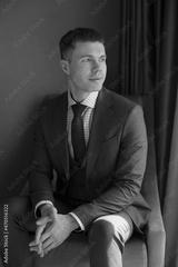 Fashionable young man wearing suit in the interior. Handsome young model in a classic style suit posing in an armchair