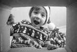 Happy surprised Caucasian little boy in Santa's hat looking inside a cardboard box, at home near Christmas tree, bottom view. Excited little kid opening Christmas present.