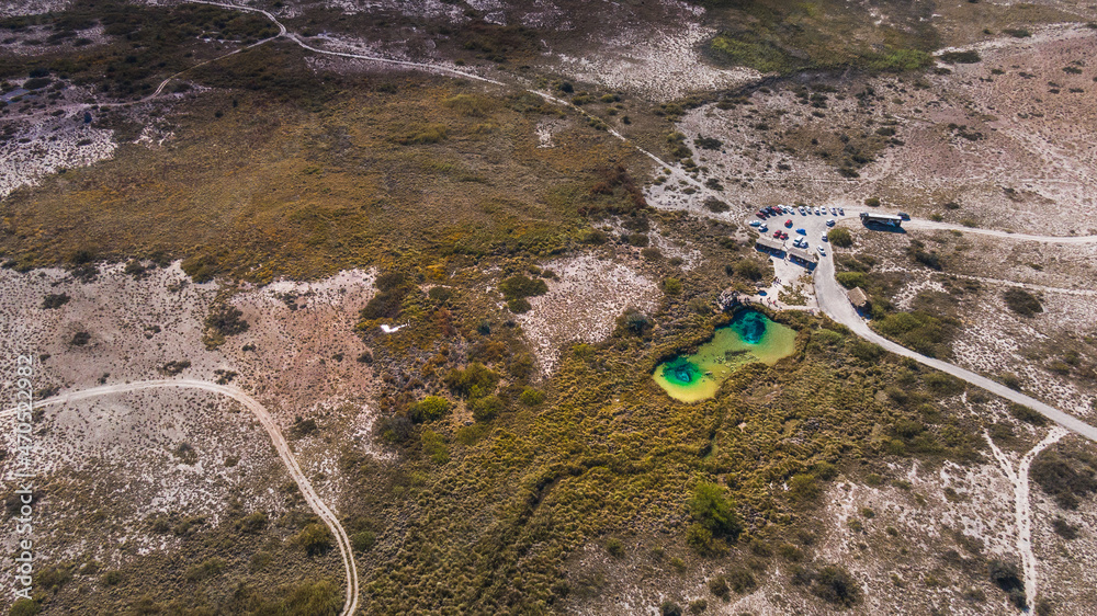 Amazing landscape with a lake and river in the middle of the desert with shades in the water of blue and turquoise green, mountains are distinguished, and the wide desert. Poza Azul, Cuatrociénegas.