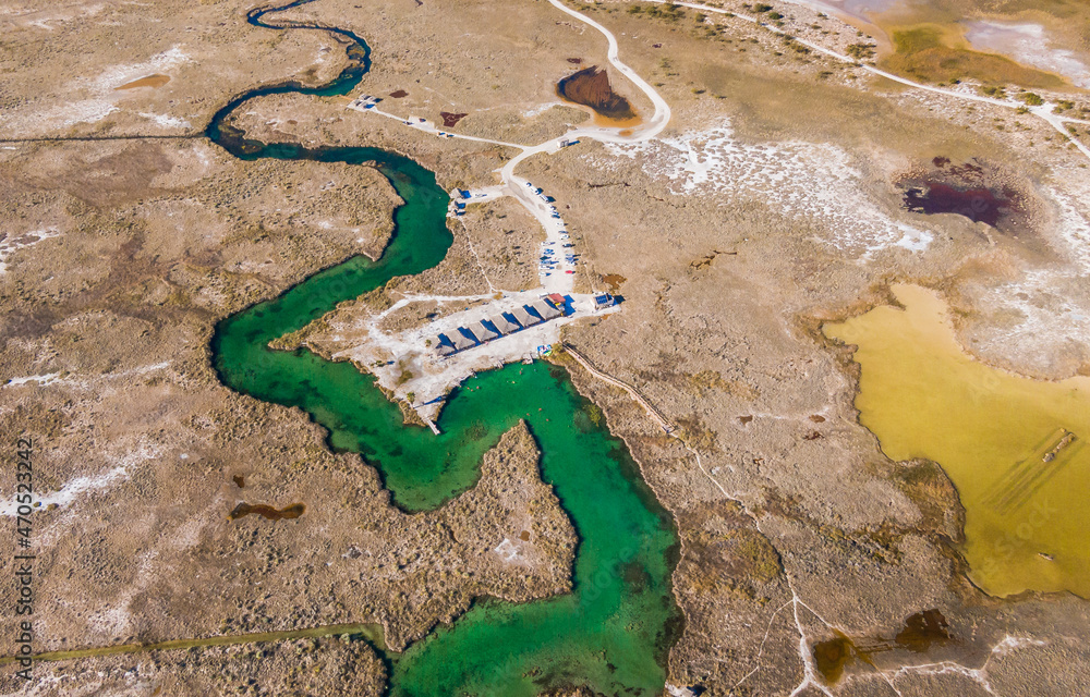 Amazing landscape with a lake and river in the middle of the desert with shades in the water of blue and turquoise green, mountains are distinguished, and the wide desert. Poza Azul, Cuatrociénegas.