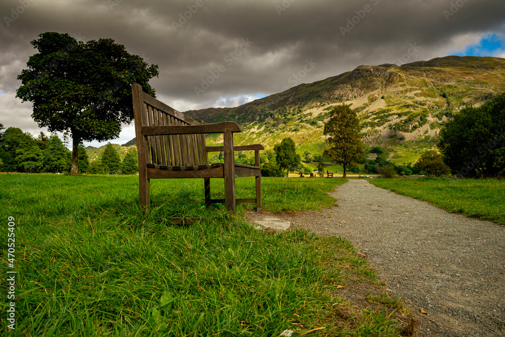 Drewniana ławka, krajobraz górski, dolina w Lake District (Kraina Jezior) obszar w północno-zachodniej Anglii w hrabstwie Kumbria