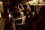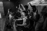 Multiracial team of happy professional cyber sports gamers celebrating success wile raising hands up during esports tournament in gaming club