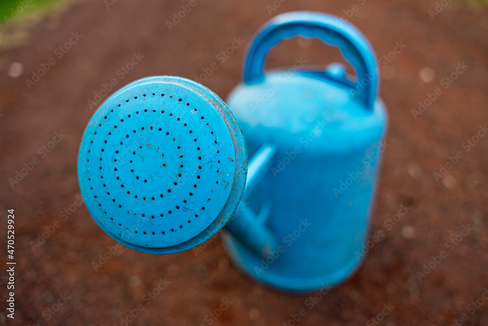 Błękitna konewka stoi na środku drogi, ujęcie z bliska.