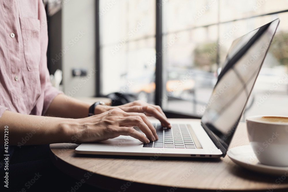 Woman working on laptop computer, female hands typing keyboard closeup, businesswoman or student girl using laptop at cafe