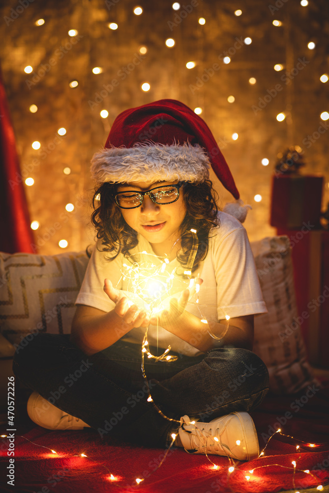 Retrato de un joven adolescente con vestimenta navideña con luces cálidas en sus manos
