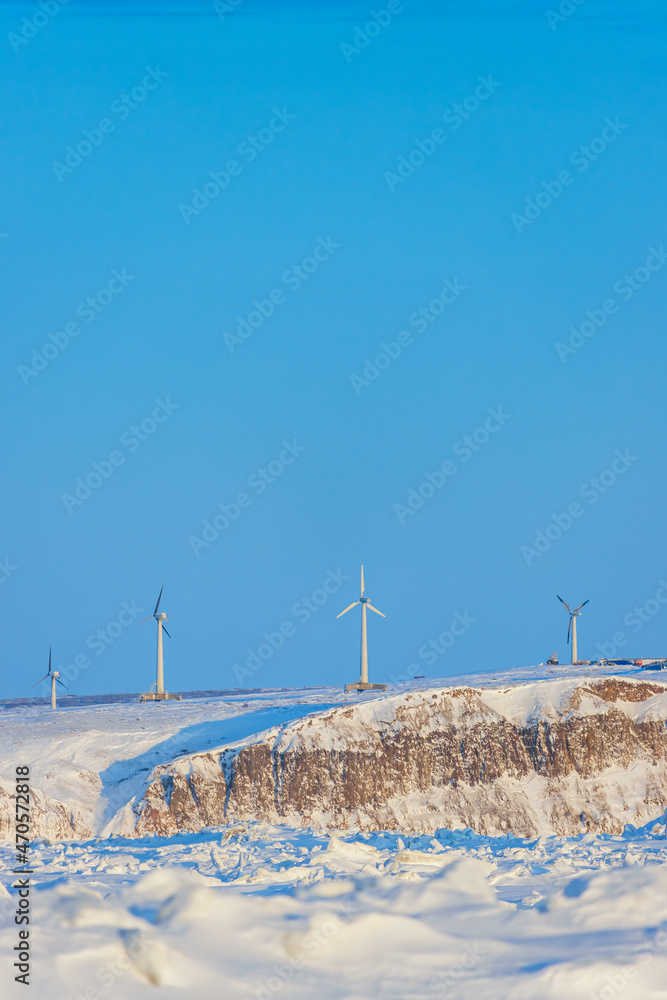 Wind farm in the Arctic on the sea coast. Wind turbines on a high rocky shore against a blue sky. Snow-covered ice. Green renewable energy. Modern electric power industry. Chukotka, Far East of Russia