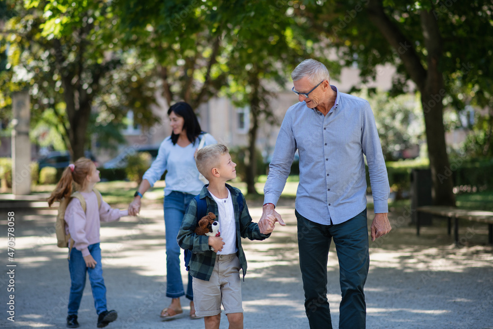 Happy grandparents taking grandchildren home from school, walking outdoors in street.