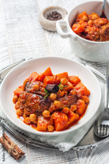 Pumpkin, lamb and chickpea stew with cinnamon sticks. Whie wood table, vertical image.
