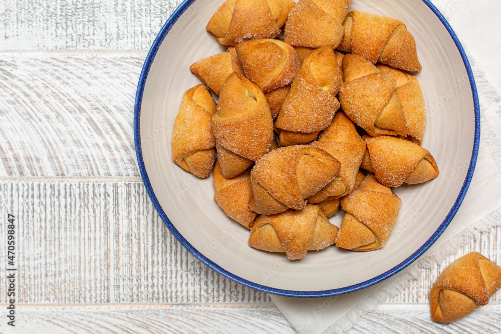 Close-up of homemade filled rolled pastries. Made with butter and cream cheese doughs. White wooden surface.
