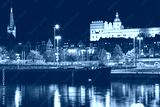 Odra River waterfront with Ducal Castle in Szczecin at night, color toning applied, Poland.