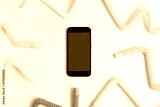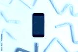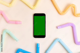 Mobile phone and Trendy kids toys pastel colorful pop-tube on beige background. Set of forms and colors corrugated pipe and anti stressing, relaxation fidget finger toys and technology .