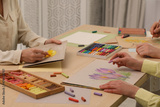 Artists drawing with soft pastels and pencils at table indoors, closeup
