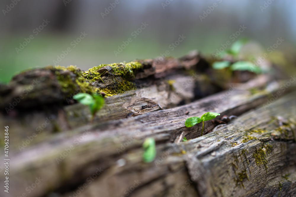 Leśny ogródek, siewki rosnące na omszałym pniu. Kolory zielony i brązowy.