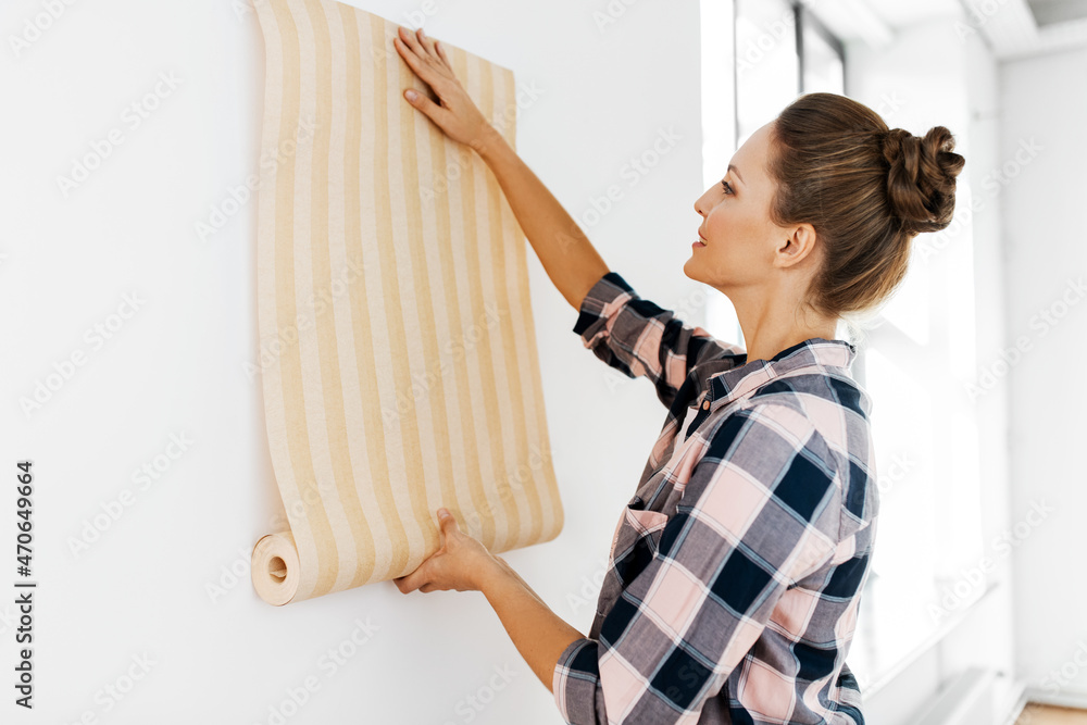 repair, improvement and renovation concept - happy smiling woman applying wallpaper to wall at home