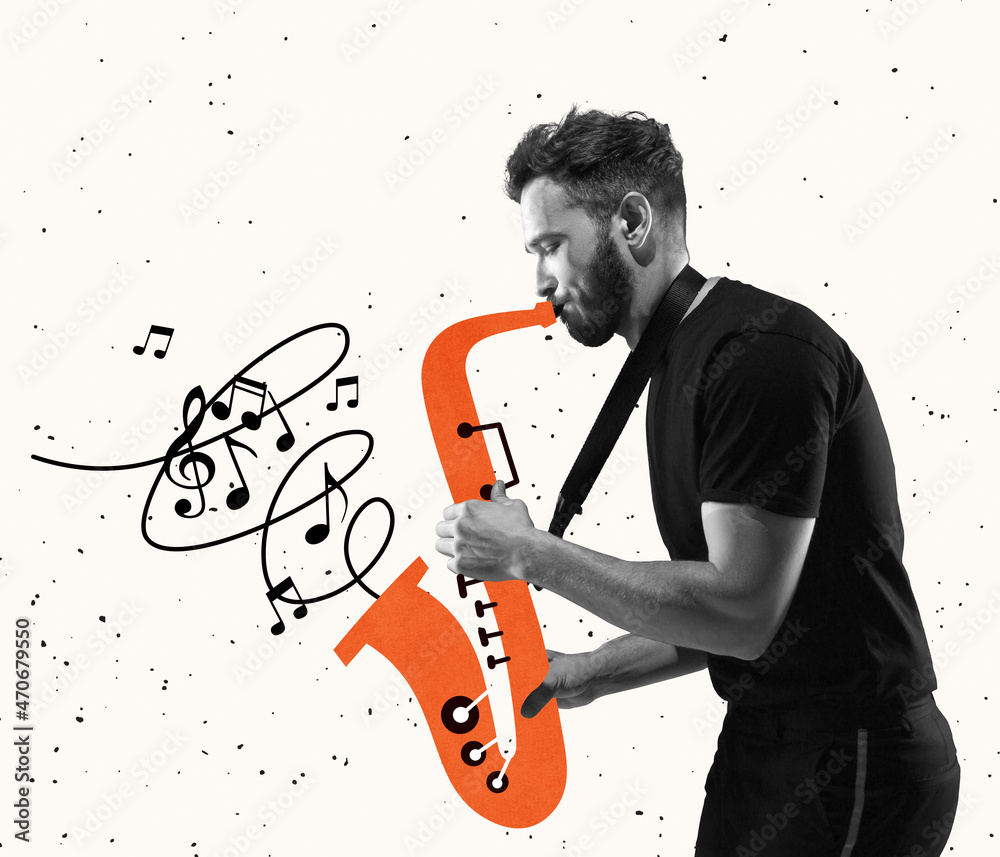 Contemporary art collage, modern design. Retro style. Stylish hipster, man playing saxophone on light background