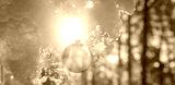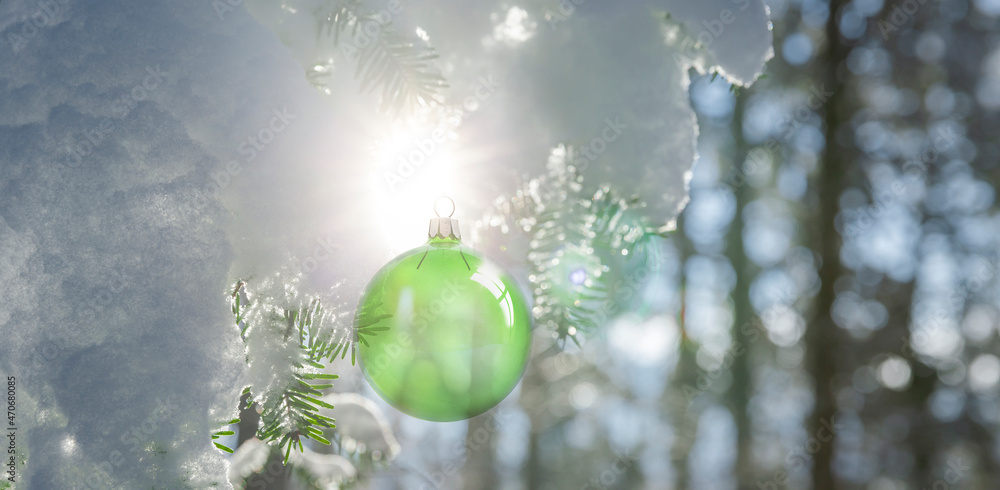 Grüne Weihanchtskugeln an einem schneebedeckten Tannenzweig