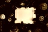 Empty picture frame with pine tree and natural christmas decoration on dark brown background. Flat lay minimal new year mockup template. Creative styled image with trendy organic christmas baubles.