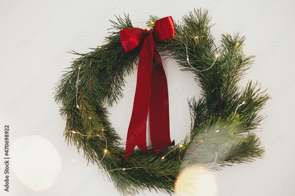 Merry Christmas and Happy Holidays! Stylish christmas wreath with red bow and golden lights hanging on white wall. Simple traditional xmas wreath with pine branches and red ribbon isolated on white