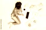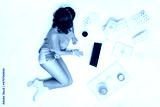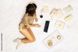 Christmas sale, discount. Online shopping. Woman using laptop for making order, buying gifts, lying on the snow-white carpet among many wrapped boxes. Top view. Concept
