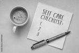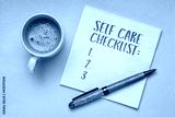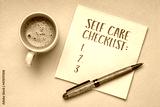 self care checklist - handwriting on a napkin with a cup of coffee, healthy lifestyle, habits and personal development concepts