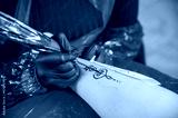 Close up of young female tattoo artist works making an unalome piece on a girl's leg using a sketch inside a tatto studio.