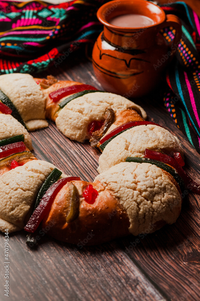 Rosca de reyes or Epiphany cake and clay mug of mexican hot chocolate on a wooden table in Mexico Latin America