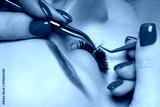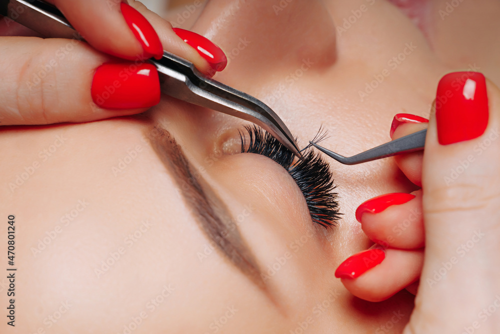 Eyelash Extension Procedure. Woman Eye with Long Eyelashes. Close up, selective focus.