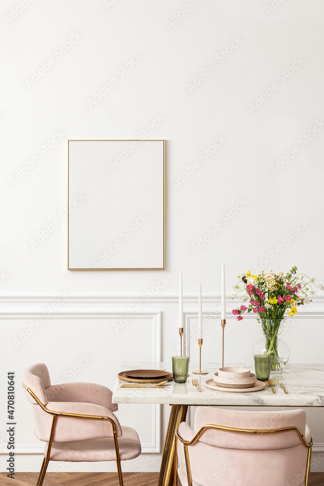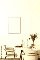 Blank canvas by a dining table in a modern boho chic aesthetic dining room