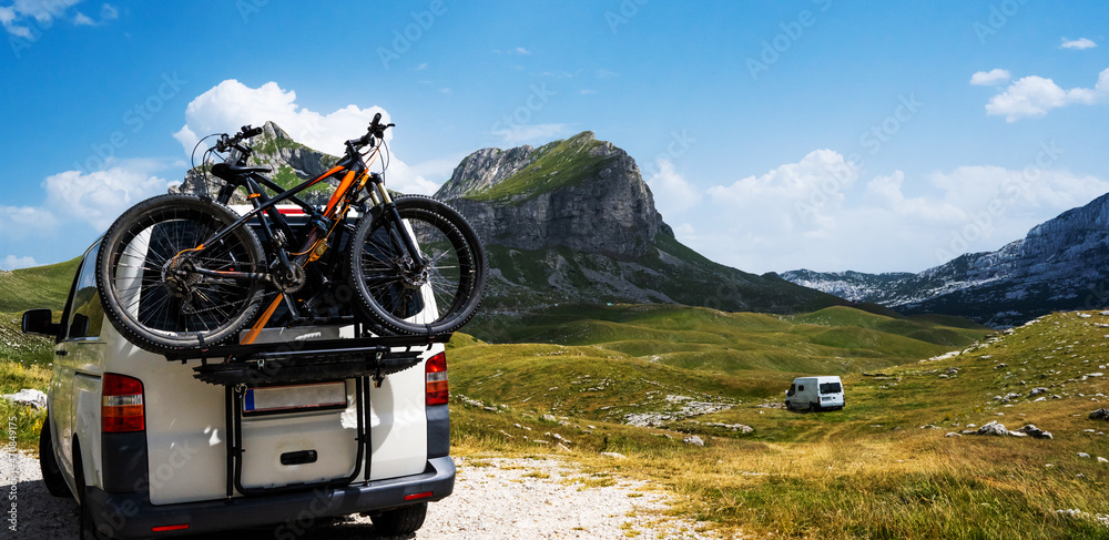 White car with bike in the mountains of National park Durmitor in Montenegro. Vehicle and beautiful nature landscape in sunny day