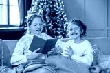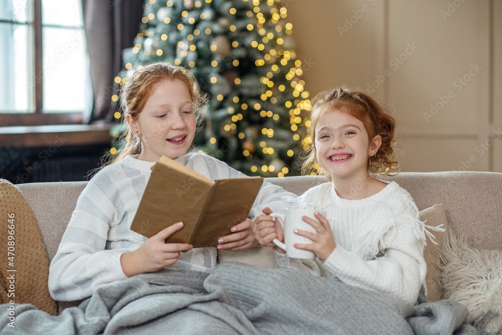 Two sisters are sitting on the couch and reading a book. Delicious hot cocoa. Children smile.