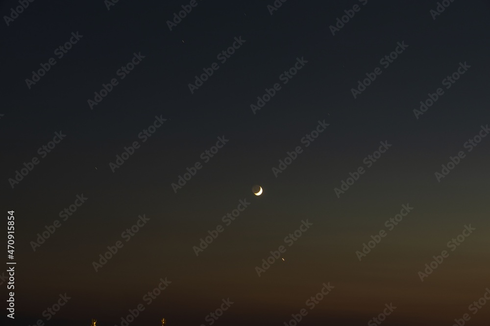 Beautiful view of landscape on night sky with a crescent moon and stars.