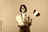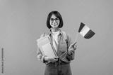 Travel and student exchange. Happy young woman in glasses with notebooks, backpack, holding small flag of France