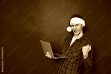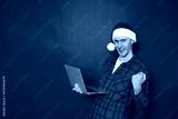 an excited man in Christmas hat, casual clothes with laptop in his hand, triumphs by showing victorious gesture with his arm bent at elbow. concept - winning, success, luck, lottery, new year, holiday