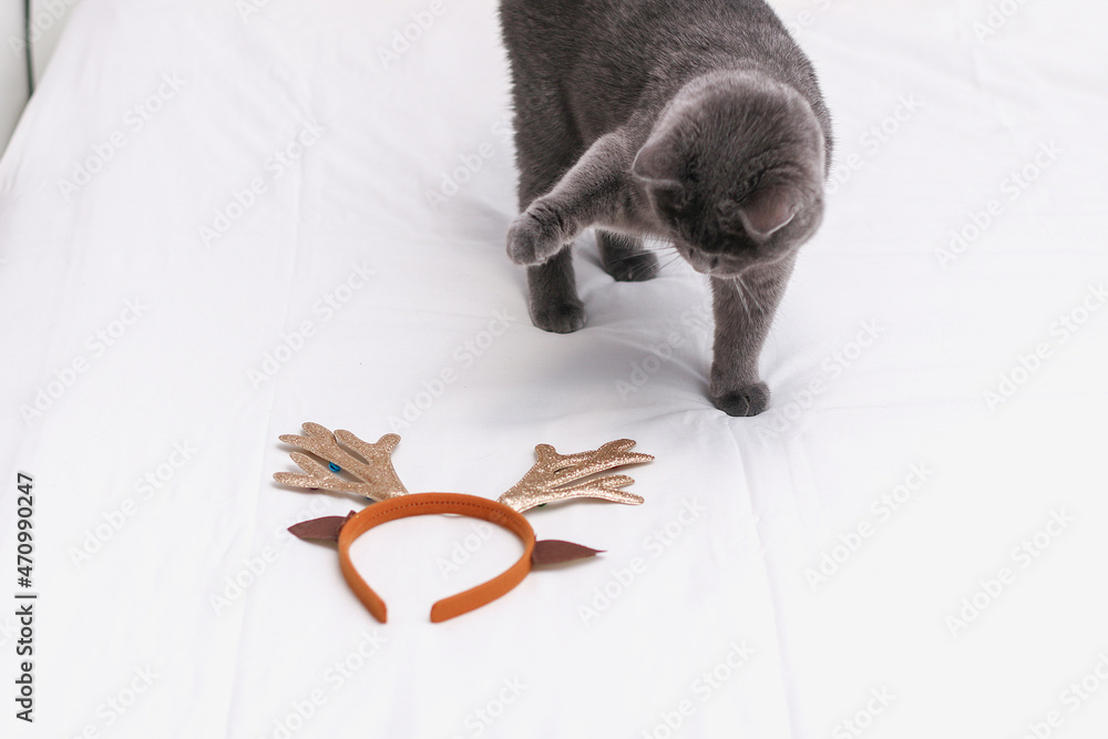 Chartreuse cat on a background of gold foil inflated numbers 2022 plays with antlers. Fear, phobia, fear of bells, noisy objects.