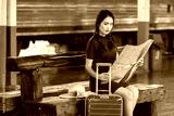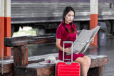 Asian woman pregnant in red dress carrying red luggage and look at the map at railway station travel,traveler with backpack in summer Holiday concept Thailand