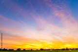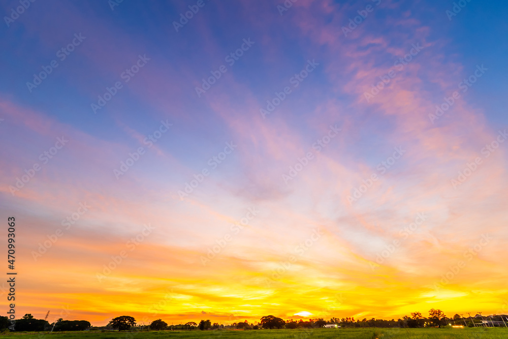 Twilight blue bright and orange yellow dramatic sunset sky in countryside or beach colorful cloudscape texture with white clouds air background.