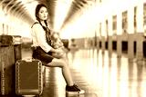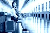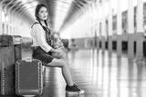 Asian pregnant woman traveler sitting on hugging Teddy Bear with a red suitcase at railway station travel,traveler with backpack in summer Holiday concept Thailand