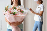 Woman with bouquet of flowers received from courier