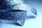 Macro abstract texture background of sparkling gold color Christmas holiday glitter ribbon with bokeh and copy space